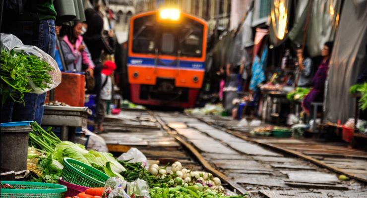 如泰國傳統市場販售各種新鮮蔬果、魚肉與海鮮。參訪市場也可了解當地人的生活與飲食文化,不同於一般市場,你可以看到小販們是沿著鐵軌兩旁擺設攤位,而當聽到火車鳴笛聲響起,小販們不慌不忙地俐落收拾,讓火車慢行而過。