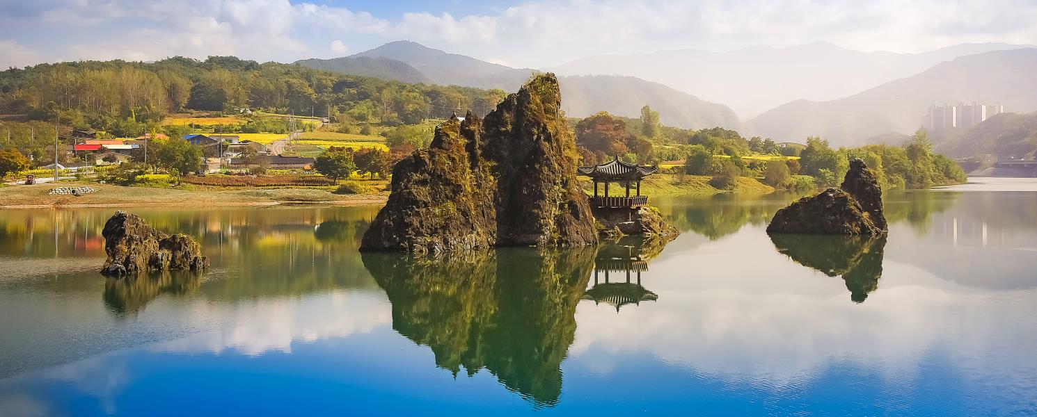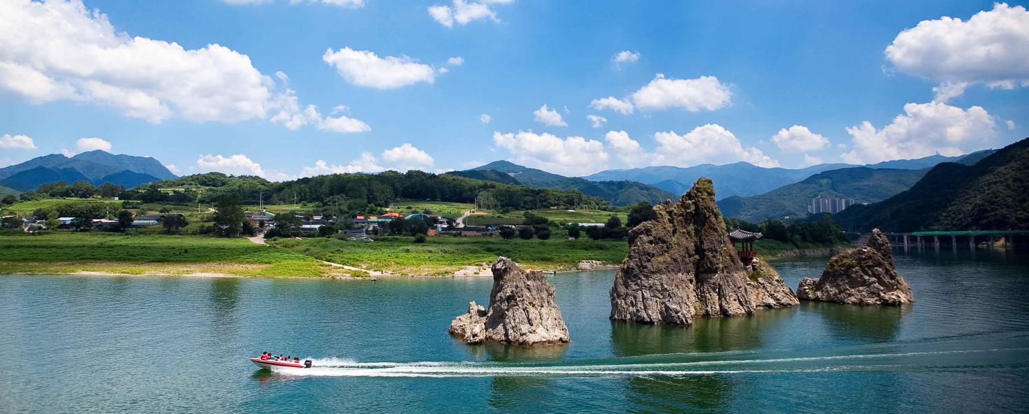 嶋潭三峰靜臥丹陽南漢江畔,三座岩峰並肩而立,氣勢磅礡,分別為將軍峰、妻峰與妾峰。最高的將軍峰上築有三嶋亭,昔日文人雅士曾登臨吟詩賞月,為山水添上濃厚人文氣息。江水環抱、群山相映,晨霧輕籠時更顯如詩如畫。岩峰倒映碧波,構成壯麗畫面,是攝影與賞景的絕佳名勝。