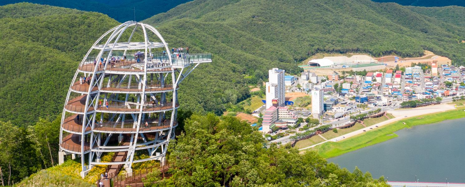 位於丹陽郡赤城面的滿天下Skywalk,建於離地約80至90公尺的南漢江峭壁之上,是挑戰膽量的天空步道。沿著通往觀景臺的螺旋步道前行,可從不同角度飽覽山河美景;登頂後,南漢江壯闊景色與丹陽市區風光盡收眼底,遠方更可眺望小白山蓮花峰。馬蹄形觀景臺外伸三段透明玻璃步道,長15公尺、寬2公尺,腳下江水奔流,驚險又震撼。