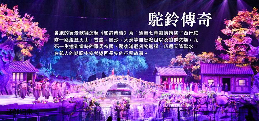【駝鈴傳奇秀】於西安浐灞華夏大劇院上演,以絲綢之路商隊為主線,串起〈送君千里〉、〈狼道遇險〉、〈異國風情〉等章節,重現穿越火山、雪崩、風沙的西行壯旅,遠抵古羅馬再凱旋長安。劇場以水為台,360°旋轉舞台與可移動觀眾席打造沉浸視角;高空水幕與聲光特效震撼,前排偶有水花增添臨場感,節奏俐落,親子與團體皆宜。