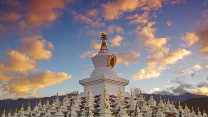 稻城白塔,藏語叫「郎傑曲登」。據說,當年釋迦牟尼涅槃之時,眾多信徒祈求世尊法身長駐,佛陀便囑修尊勝塔,並親自加持開光,以此代表法身;白塔的塔尖、塔基座安放著一排排的轉經輪,以供藏民虔誠膜拜,是藏傳佛教聖地之一。