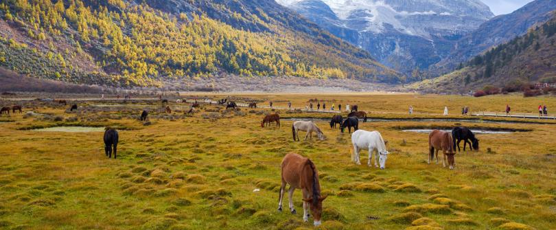 亞丁景區最著名的景點之一,是附近村民放牧的高山牧場,成群的牛羊在這裡享受著充足的陽光、青青的草地和純淨的湖水;每年5月草長鷹飛,風吹草低現犛牛,又背靠三座神山仙乃日、央邁勇、夏諾多吉,是觀看三座雪山的最佳地點。