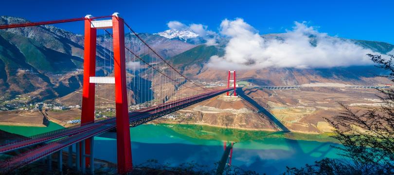 又名興康特大橋,主跨1100米、全長1411米,是世界級的超大跨度橋梁,雅康特大橋建於高海拔、地震烈度高、風場複雜的山谷中,施工難度極大,集結多項世界級技術難關;作為雅康高速公路的關鍵節點,又被稱為「川藏第一橋」。