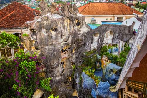 為留學俄羅斯的越南女建築師設計,整體設計酷似一個巨大枯掉的大樹,外牆覆蓋奇形怪狀的「根系」,結合了動物,蘑菇,蜘蛛網和洞穴雕塑的設計想法。建築怪異的瘋狂屋,每一棟建築都可以攀頂上高樓,迷幻的設計讓您每走一步每上一個階梯都覺得有趣又怪異,彷彿進入奇幻冒險世界和童話氛圍與藝術靈魂,絕對值得一探究竟。