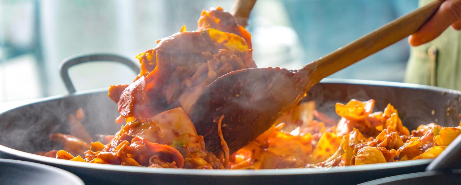 韓國最具代表性的美食絕對是《春川辣炒雞》!在鐵板上撒上鮮脆爽嫩的高麗菜及大蔥,再舖上醃製入味的軟嫩雞腿肉及年糕,待鐵板開始滋滋作響,就是可以動手炒出美味的訊號音。最後的炒飯更是畫龍點睛,蒸氣騰騰的白飯加入海苔後與醬料炒至焦香,作為這一餐最完美的句點。