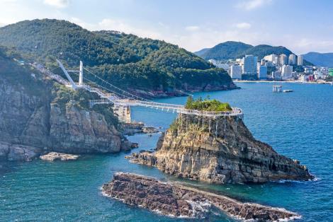 松島海水域東側的龜島上,擁有韓國最長的海上步道,全長超過100米。從燈塔出發,漫步在這片透明強化玻璃步道上,仿佛置身雲端,享受絕美海景。天空步道連接陸地與位於松島海水浴場東邊的龜島,讓人體驗在大海上行走的奇妙感覺