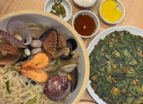 午餐:★釜山必嘗網紅美食★【侍郎台】海鮮刀削麵+海鮮煎餅+黃金炸蝦(四人一桌共餐/餐標15000韓元)