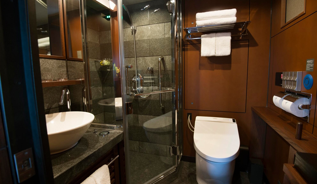 住宿房間是以冬天為主題。透過沈穩的棕色,搭配溫暖柔和的黃光,甚至在特定房型中設置了模擬暖爐,打造溫暖溫馨的空間。全車客房皆附設獨立衛浴,客房色調為舒服沉靜的顏色搭配上和漆及岩手的淨法寺漆製的壁板、致敬傳統工藝品仙台箪笥打造而成的衣櫃等,注入四季島沿線的傳統工藝要素與巧思,讓您在列車中體驗最奢華感受,度過極致的一趟旅程。